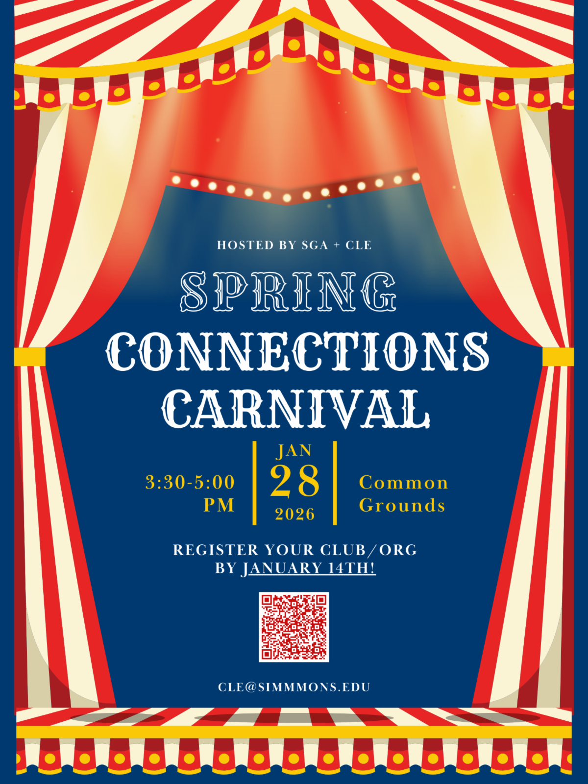 The Spring Connections Carnival is taking place on Wednesday, January 28 from 3:30 to 5:00 pm in the Common Grounds and Fens Cafe. Swing by to learn about our 40+ student organizations and meet org members!